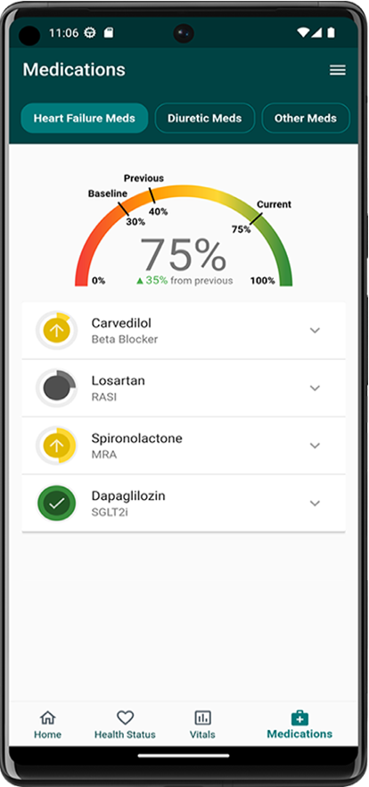 The Heart Failure Mobile App uses a medication algorithm to streamline the titration decisions for providers. The app tracks the patient’s medications, blood pressure results, and self-reported symptoms then uses these factors to recommend medication changes.